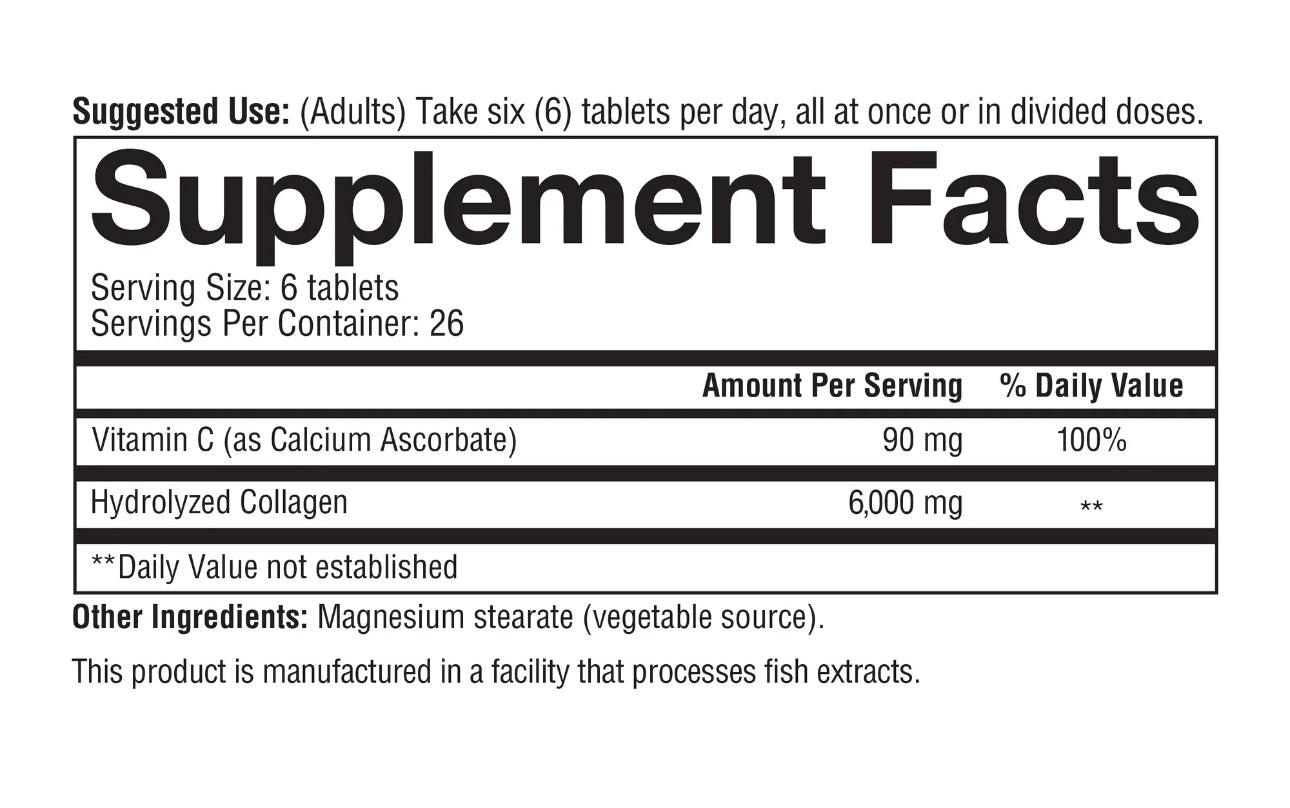 Ingredients: Vitamin C (as Calcium Ascorbate), Hydrolyzed Collagen & Magnesium stearate (vegetable source).
