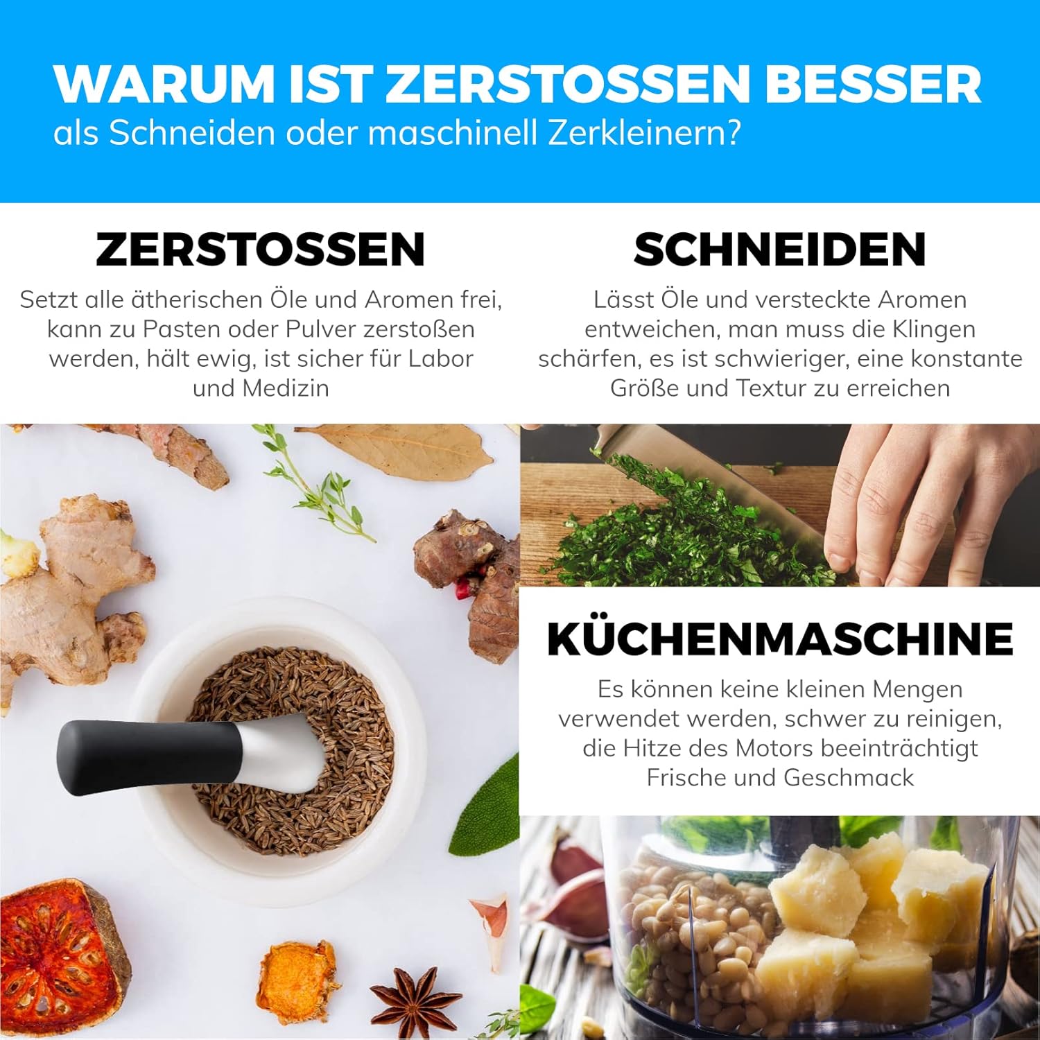 - APOTHECARY GRADE PORCELAIN- Pharmacies traditionally use non-porous porcelain to grind medication - with great reason. Consider these common issues: wood absorbs the taste of the previous grind - yuck! Marble or granite create marble powder- gross! Stone is is hard to clean, and you can't use soap to wash it! Stainless Steel can rust! Our perfectly designed, easy to clean porcelain mortar and pestle allows you to grind your spices, nuts, coffee, muddle drinks, human or pet medication, guacamole,