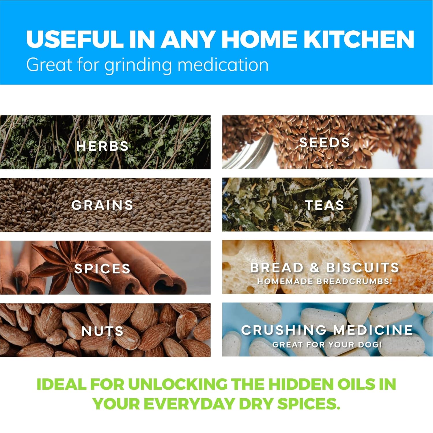 - USEFUL IN ANY HOME KITCHEN OR TO GRIND MEDICATION - GREAT FOR: powdering herbs, grains, spices, nuts, seeds, teas, bread, biscuits (for making homemade bread crumbs!), science experiments, or even crushing medicines for pets (great for your dog!) and humans alike. Ideal for unlocking the hidden oils in your everyday dry spices.