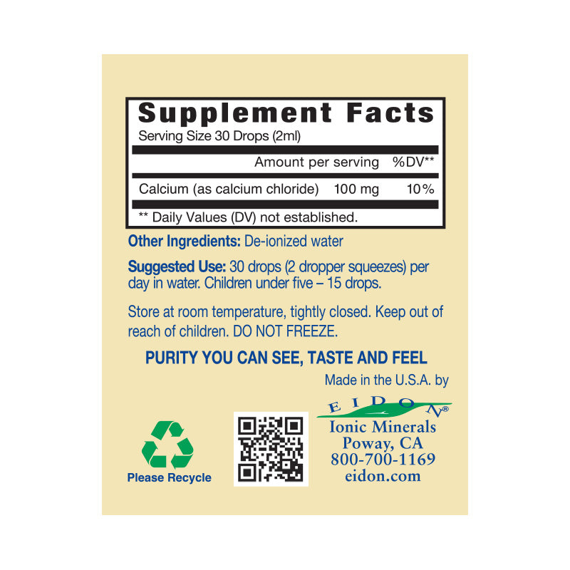 The concern is getting the correct balance of minerals for Calcium to be effective. Calcium management issues can be due to a lack of dietary Silica. In fact, in the first volume of "Silica: the Forgotten Nutrient," author Klaus Kaufmann challenges the sole use of Calcium supplementation by adults and shows its interdependency with Silica. When evaluating the amount of Calcium in Eidon’s supplement, measured in milligrams, it seems that it contains very little Calcium. Keep in mind that the amount of absorbable Calcium available in a traditional tablet or capsule is highly questionable. However, Eidon's ionic liquid Calcium is bioavailable and quickly absorbed.