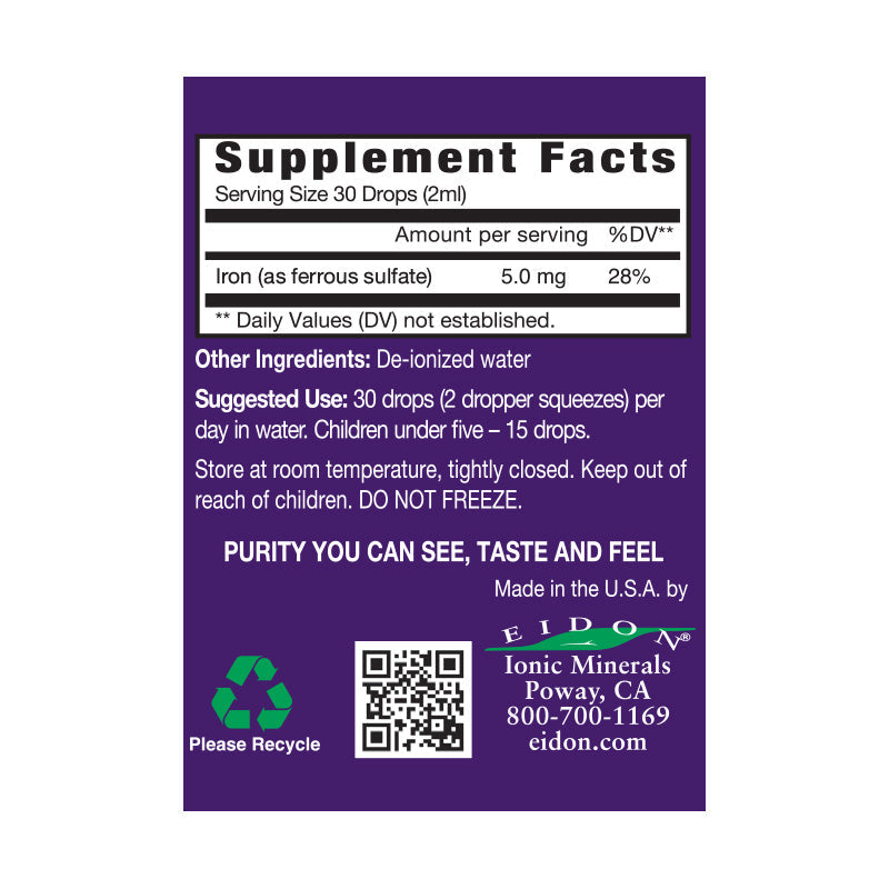 Supplementing with Eidon’s liquid Iron will help you get an adequate amount while not overburdening the body with excess. Eidon’s Iron has a recommended dose of 5mg per serving. This allows one to easily customize their dosing to whatever level they wish.