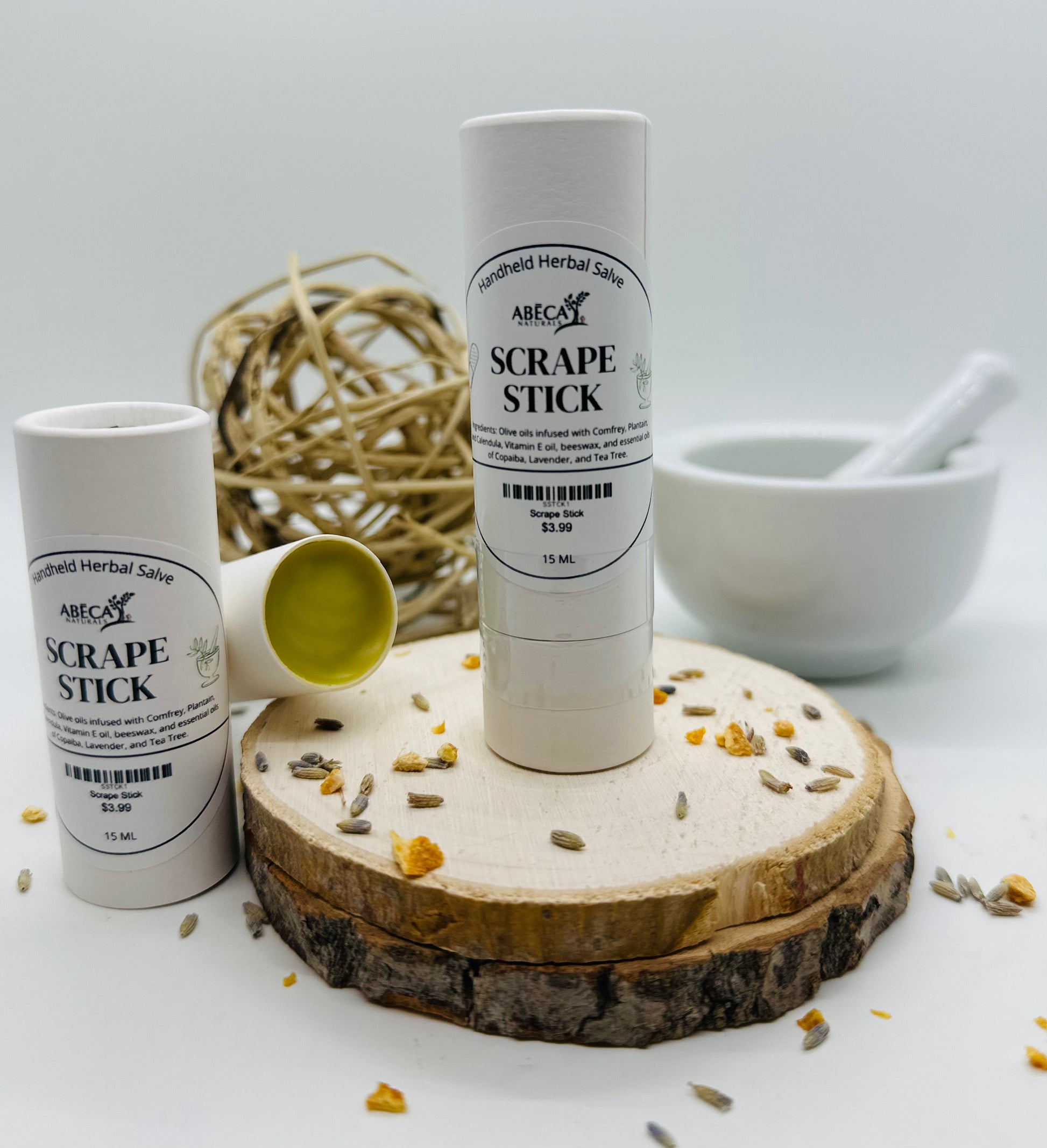 We've taken some of the most powerful topical herbs for skin and bruising, and comibined them with the antifungal and antibacterial properties of essential oils like Tea tree, Lavender, and Copaiba. This Scrape Stick is perfect for soothing bumps and bruises on the go!