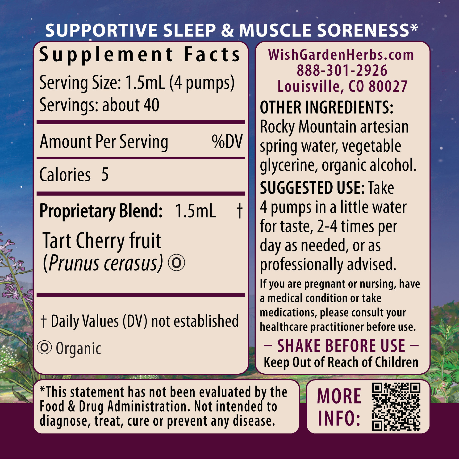 Organic Tart Cherry fruit (Prunus cerasus), Rocky Mountain artesian spring water, organic gluten-free alcohol & vegetable glycerine.